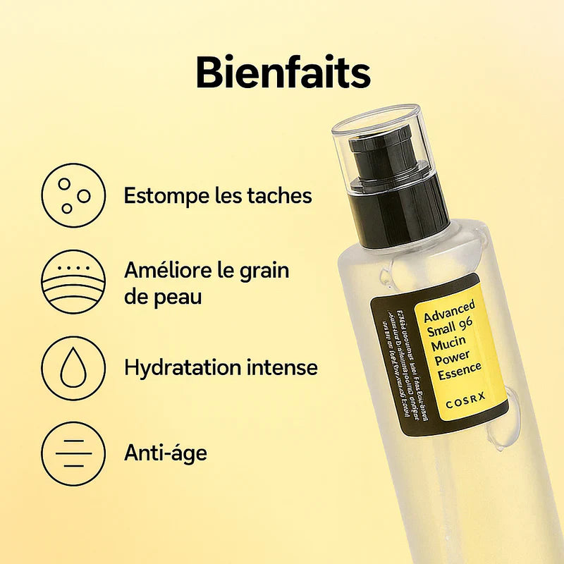 L’Advanced Snail 96 Power Mucin de COSRX est une essence culte contenant 96 % de filtrat de sécrétion d’escargot, reconnue pour ses vertus réparatrices et hydratantes. Elle favorise la régénération cellulaire, apaise les peaux irritées et redonne souplesse et éclat à toutes les peaux, même les plus sensibles.