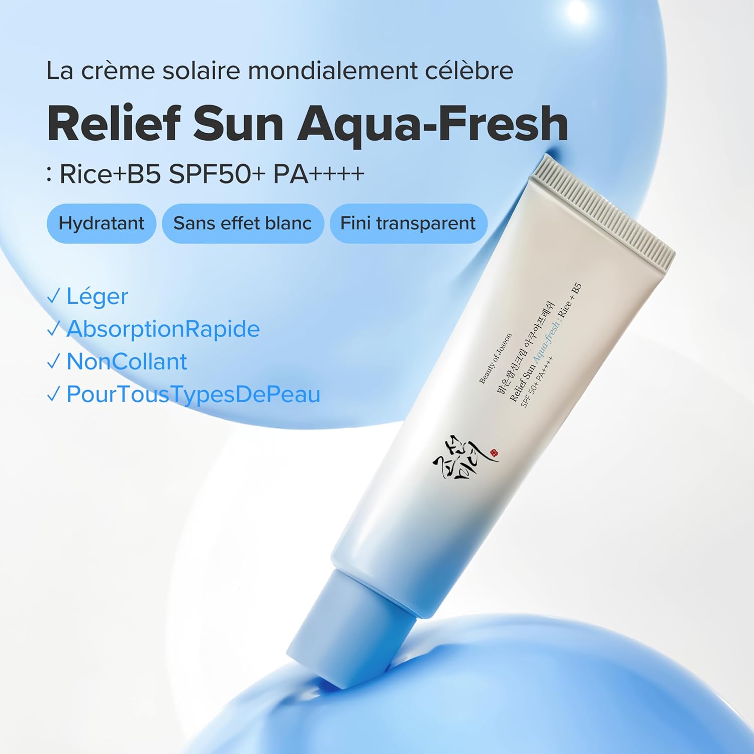 La Relief Sun Aqua-Fresh de Beauty of Joseon est une crème solaire légère SPF 50+ PA++++, formulée avec du panthénol et de l’eau de graine de riz. Elle protège efficacement tout en hydratant et apaisant la peau, sans fini gras ni trace blanche.
