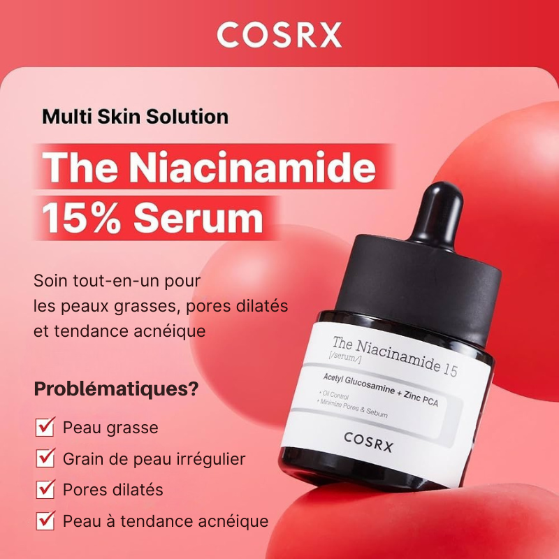 Le The Niacinamide 15 Serum de COSRX est un soin anti-imperfections hautement concentré à 15 % de niacinamide, spécialement formulé pour les peaux grasses, mixtes ou sujettes à l’acné. Il régule le sébum, réduit les pores dilatés et affine la texture de la peau sans irritation.