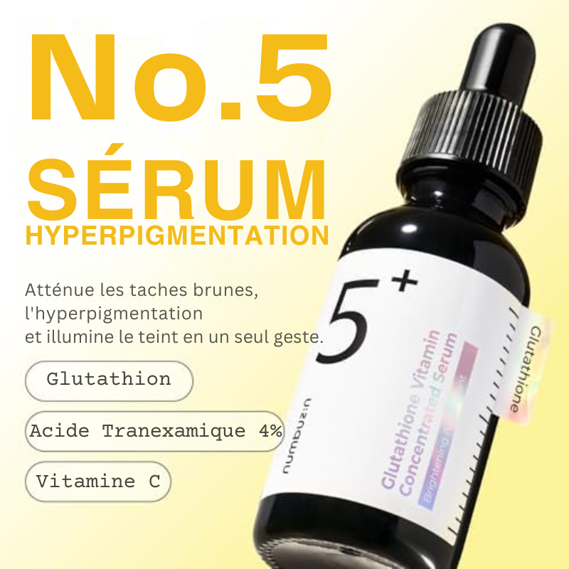 Le Sérum Vitamine Concentrée No.5 de Numbuzin est un soin intensif qui illumine le teint, atténue les taches pigmentaires et redonne éclat et vitalité à la peau. Enrichi en vitamine C, alpha-arbutine, glutathion et niacinamide, il agit sur les signes du vieillissement, l’hyperpigmentation et le teint terne tout en hydratant profondément.